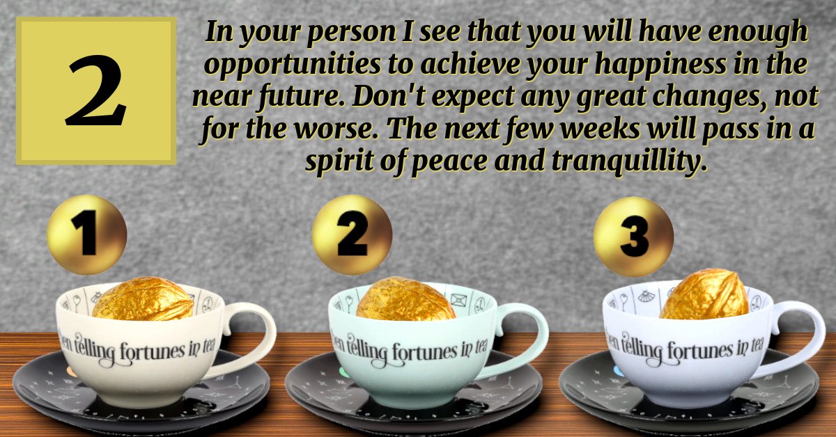 In your person I see that you will have enough opportunities to achieve your happiness in the near future. Don't expect any great changes, not for the worse. The next few weeks will pass in a spirit of peace and tranquillity.