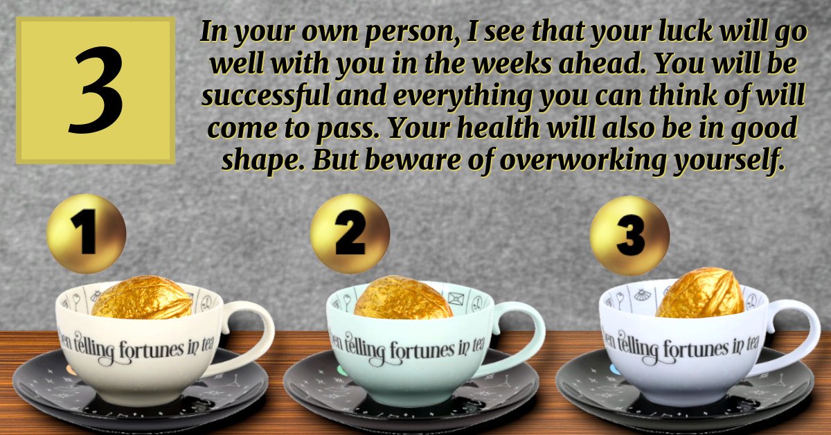 In your own person, I see that your luck will go well with you in the weeks ahead. You will be successful and everything you can think of will come to pass. Your health will also be in good shape. But beware of overworking yourself.
