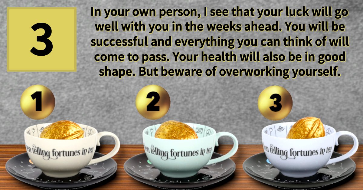 In your own person, I see that your luck will go well with you in the weeks ahead. You will be successful and everything you can think of will come to pass. Your health will also be in good shape. But beware of overworking yourself.